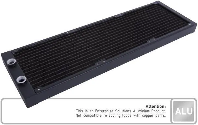 The radiators have a high fin density and are particularly suitable for use with fans with high air pressure and air throughput. This achieves a significant increase in the performance of the water-cooled components. Fitting and mounting optionsThe radiator offers an inlet and outlet (IN/OUT) with G1/4" thread. Screws for case mounting (M3x5) and for fan mounting (M3x30) are included with the radiator. Additional screws are not required for single-sided fan mounting. Important noteThis is an Enterprise Solutions Aluminum product. The ES aluminum radiators must not be used together with copper water cooling products (radiators, fitting, etc.