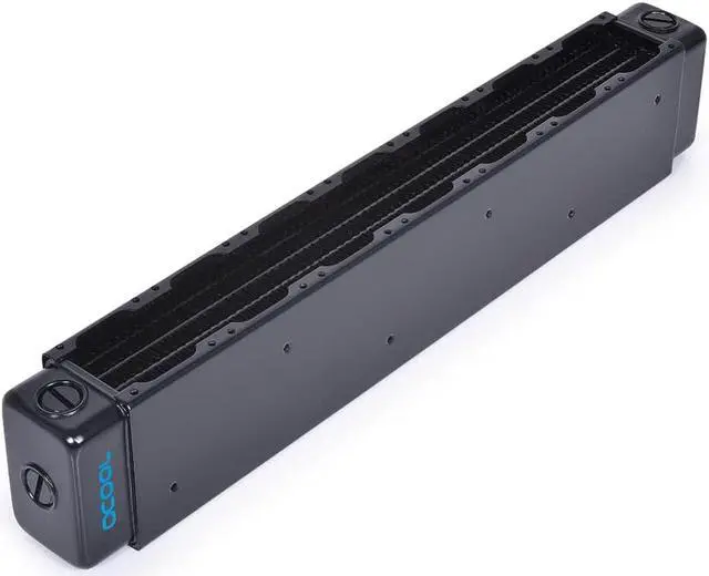 This makes it very easy to create a loop in the server rack. For example, you could go out from one side, directly into a CPU, then into one or more graphics cards and the pump, then back to the radiator on the other side. Powerful cooling performance To maximise the performance of the radiator, Alphacool reaches deep into its bag of tricks and uses pure copper for the cooling fins, cooling channels and pre-chambers. Due to the high thermal conductivity of 400