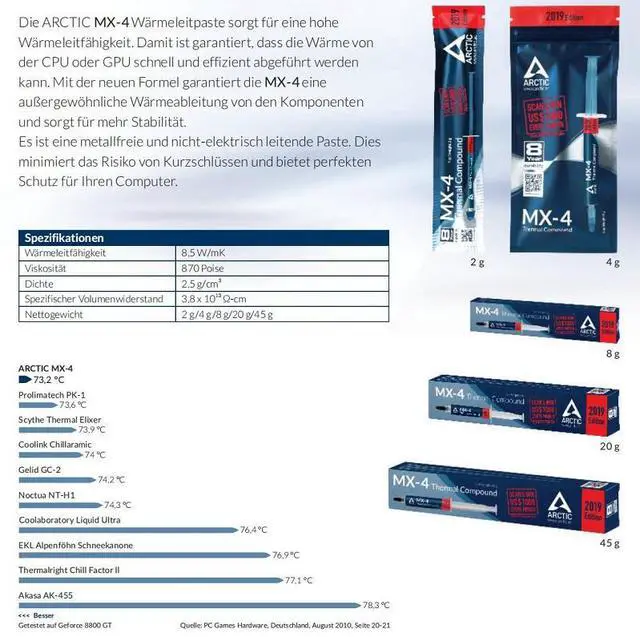 Thermal compound is necessary to create a reliable transfer of heat from your computer's processor to its heatsink to keep your CPU from overheating. Arctic Silver MX-4 thermal compound does this with three unique shapes and sizes of pure silver particles to maximize particle-to-particle contact area and thermal transfer. It's optimized for use between modern high-power CPUs and high-performance heatsinks or water-cooling solutions. This 8-gram tube contains enough compound to cover at least 40 to 50 small CPU cores, or 15 to 25 large CPU cores, or 5 to 12 heat plates.
