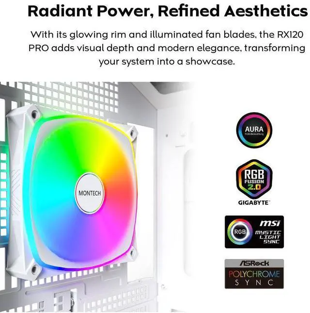 The RX120 PRO builds on the legacy of the original RX series, long established as the cooling backbone of MONTECH's flagship cases and standalone builds alike. This upgraded PRO version refines that proven DNA with enhanced airflow, quieter operation, and radiant design, turning reliable cooling into a showcase of power and elegance.