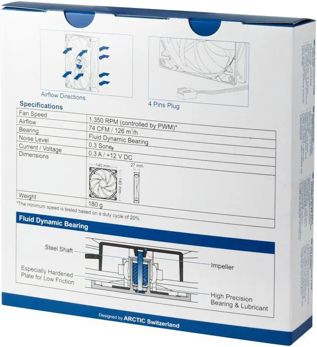 The Fluid Dynamic Bearing comes with an oil capsule that avoids lubricant leakage. Thus this bearing is as quiet as a sleeve bearing but comes with a significantly higher service life