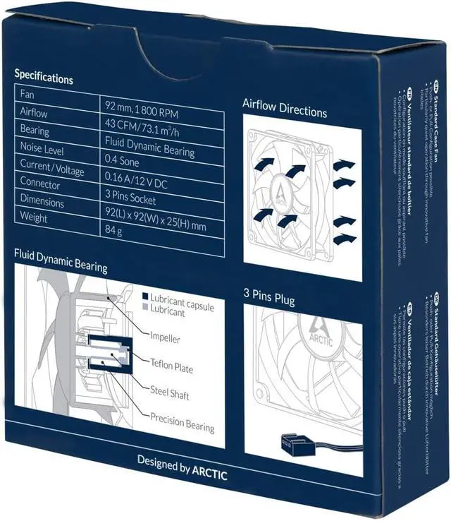 92 mm Standard Case Fan Long Service Life The Fluid Dynamic Bearing comes with an oil capsule that avoids lubricant leakage. Thus this bearing is as quiet as a sleeve bearing but comes with a significantly higher service life Innovative Design Enables Quiet and Efficient Ventilation The innovative design of the fan blades improves the air flow and facilitates a highly efficient ventilation. The impeller was designed with a focus on minimzing the noise level yet delivering the desired airflow and pressure. Two Way installation * Blow warm air out of the case * Draw cool air into your caseDescription