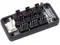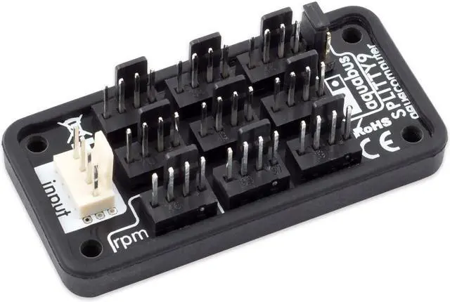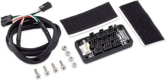 Splitty9 is a universal ninefold splitter and can be used for 3-pin fans, 4-pin PWM fans or as an aquabus splitter. When used with a fan output, the white connector marked with the word "input" is connected to a fan output using the supplied cable. Power supply and PWM signal (if available) are provided to all nine black connectors, additionally the speed signal received from the connector marked "rpm" is forwarded to the fan output. When used as aquabus splitter, the white connector marked with the word "input" is connected to the aquabus connector of an aquaero using the supplied cable. By setting the jumper to the "aquabus" position, all four aquabus signal lines are forwarded to all black connectors. The splitter can be used for 4-pin as well as 3-pin aquabus devices. A self-adhesive hook-and-loop strip is included for easy installation, alternatively four mounting holes can be used.Model: 53231