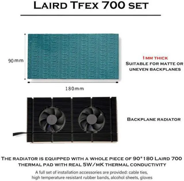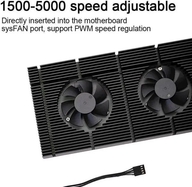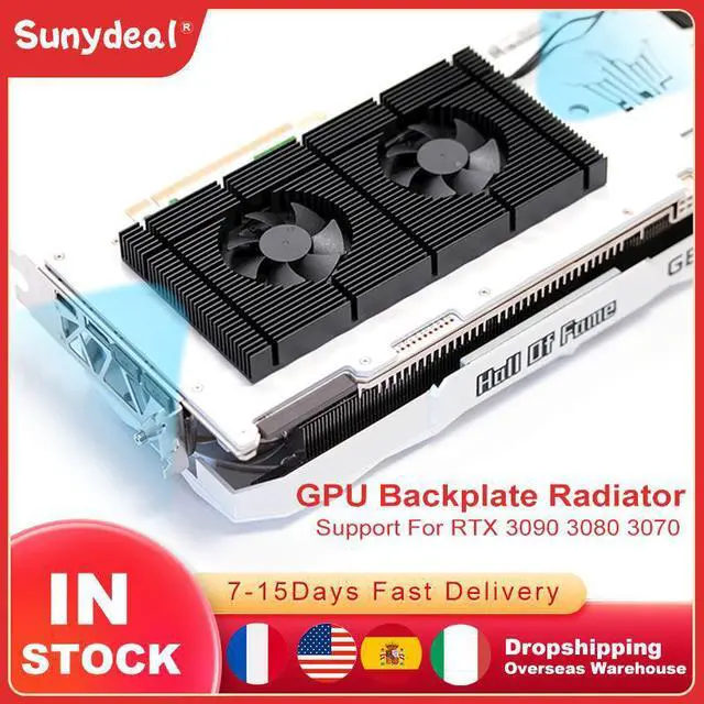 Description: Anodized black CNC machining, standard dual fan design. Good compatibility, the thickness of the radiator body is 15 mm. Support graphics card vertical installation. PS: The actual installation needs to be equipped with a thermal pad. It is directly in contact with the metal backplate and cannot conduct sufficient heat. The actual installation height is 15mm of the heat sink + the thickness of the thermal pad. Function: Solve the high-temperature problem of 3090 graphics card backplate memory. Integrated Backplate Radiator: This does not need to be patched together, easy to install. Adjustable Speed Fan: Standard dual 5010 fans, up to 20CFM under full load, low-noise hydraulic bearings, PWM speed control possible, both dynamic and static. Feature: The fan cable is a 4pin interface, which is the same as a normal chassis fan and is connected to a fan socket such as SYS FAN on the motherboard. It can be booted into the motherboard BIOS to adjust the speed, the speed range is 1500~5000 rpm, which can be adjusted arbitrarily. About the Choice of Thermal Pad: The graphics card backplate is flat: 0.5mm thick thermal pad is recommended. The graphics card backplate is uneven: 1mm thermal pad is recommended.