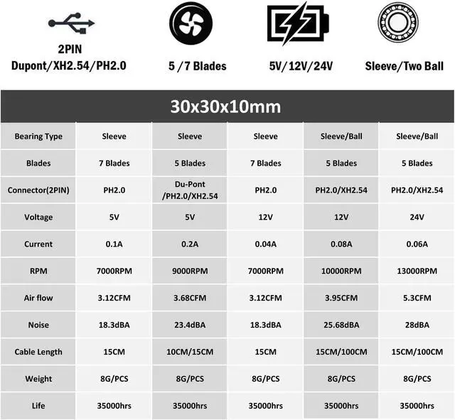 30x30x10mm 5V/12V/24V 7 Blades/5 Blades 2PIN Cooling Fan
