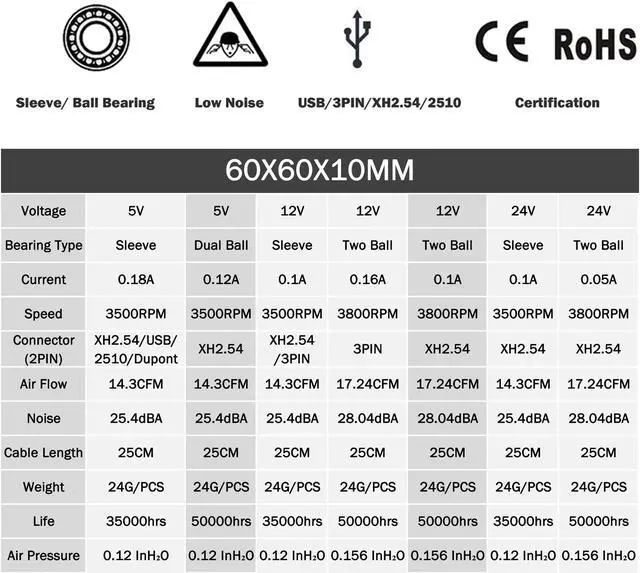 60x60x10mm 5V/12V/24V Computer CPU Case DC Cooling Fan