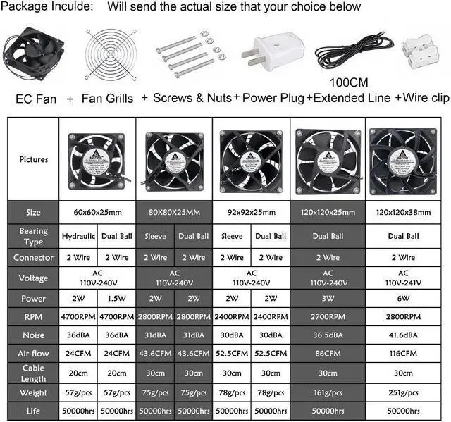 1 Set (EC Fan + 1pcs Grill + 4 sets mounting screws & nuts+1pcs Power Plug +1pcs Wire Cilb)