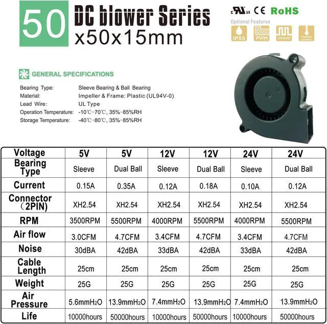 DC 5V 12V 24V Sleeve/Dual Ball Bearing 5015 Blower DC Brushless FanFeatures