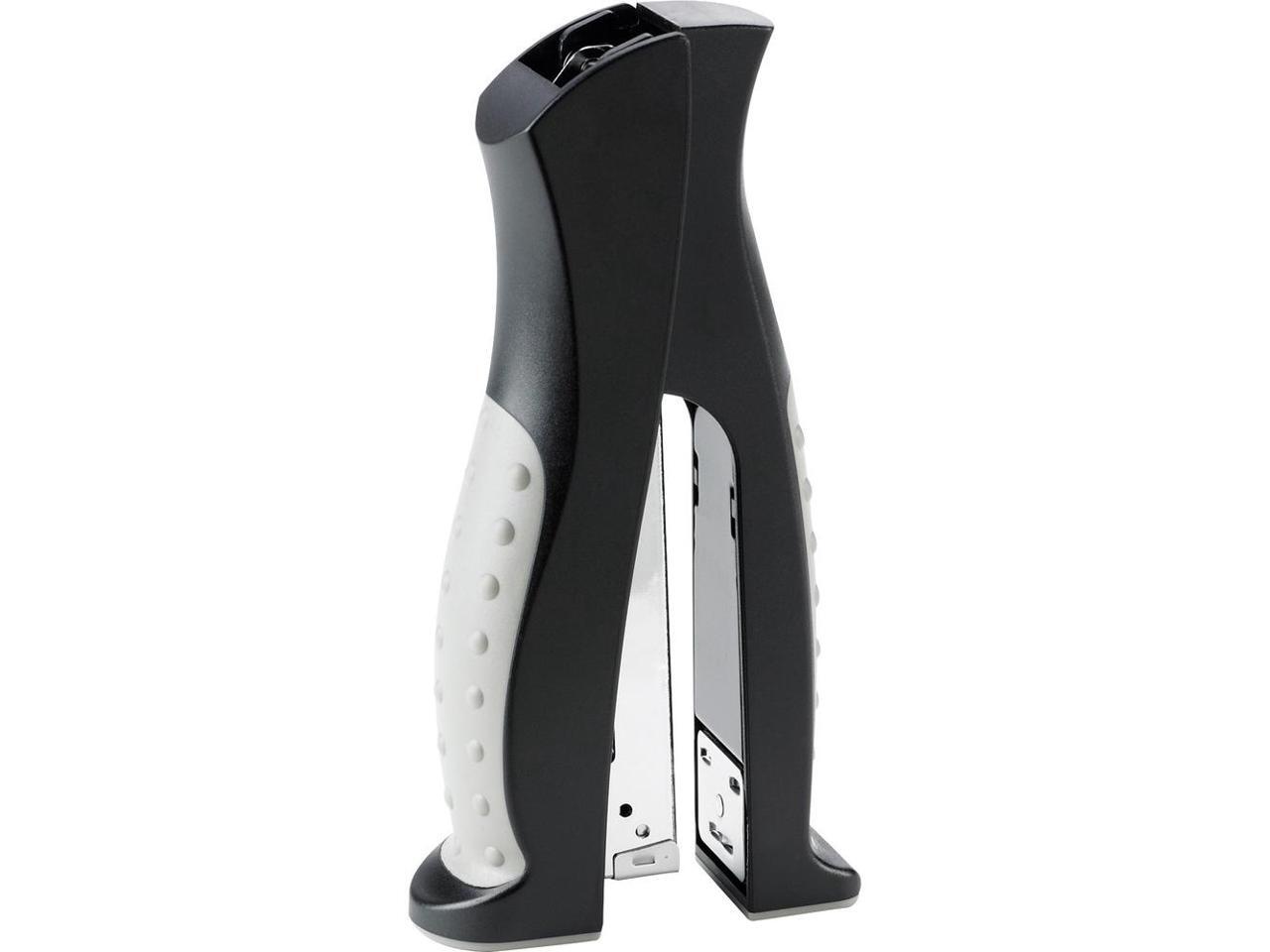 Ergonomic stand-up design uses less desk space than conventional desktop staplers. Staples up to 20 sheets of 80 gsm paper.
