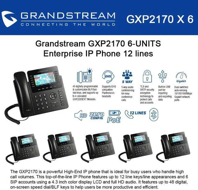 Our most powerful Enterprise IP phone, the GXP2170 supports up to 12 lines and 6 SIP accounts. It's ideal for users who handle call volumes as it includes 48 on-screen digital BLF/speed-dial keys and supports up to four of Grandstream's GXP2200EXT Module. The GXP2170 also features built-in Bluetooth, PoE, 5-way conferencing and more.