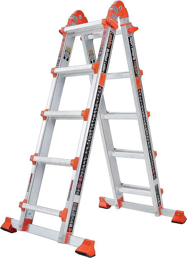 SYSTEM: strong safety joint lock, move from storage to a-frame to extension ladder configurations by toggling slightly, the u-shaped lock on the ladder' s rails allow us quickly adjust the ladder to different shape configurations, auto limit spring locks provice us much more security to climb higher with relax