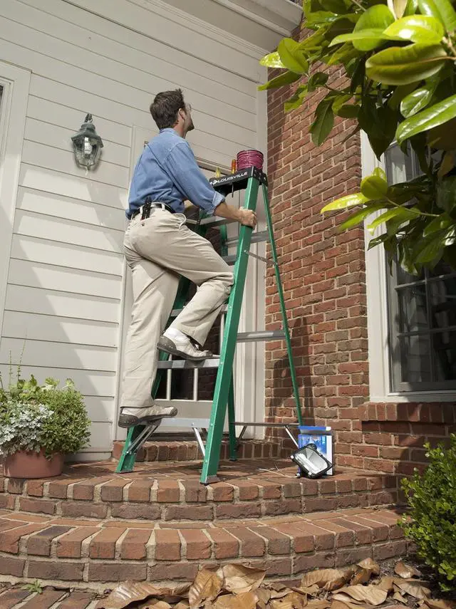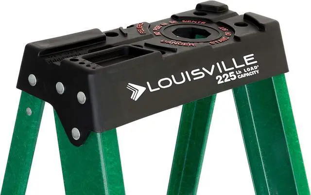 Non-conductive fiberglass commercial 4-foot stepladder with curved front of top for leg comfort