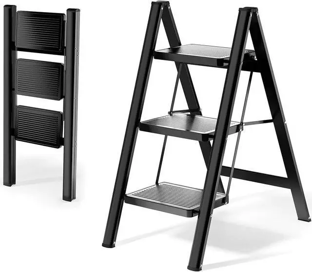 • FOLDABLE-3 STEP LADDER: The 3 step household folding steel step stool is a high priority for all families. The step ladder is made of heavy-duty steel that supports up to 330 pounds. Reach everything inside your home!