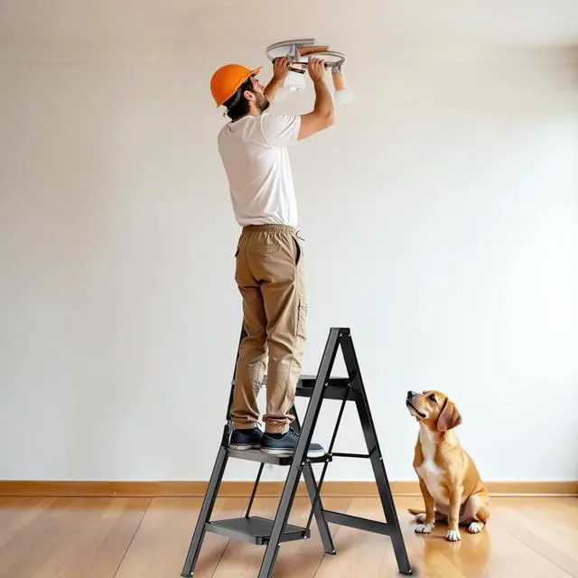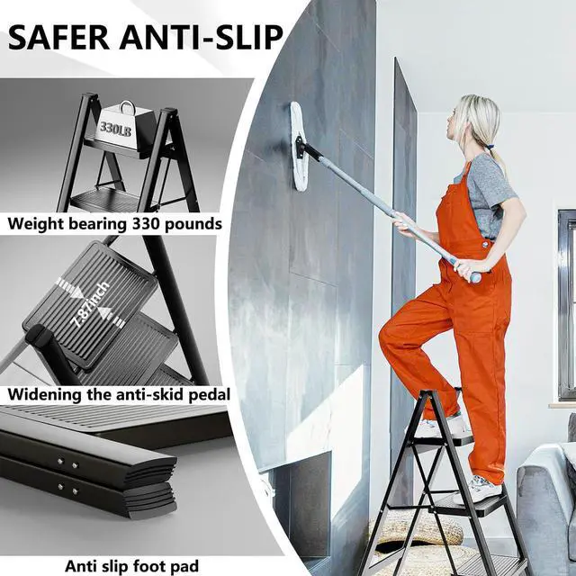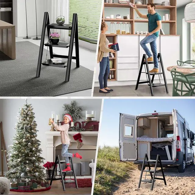 • SECURITY AND STABILITY: The 3 step ladder has a steel wide anti-slip pedal and all 4 legs have non-slip rubber caps to ensure that the ladder remains stable while you perform high-up tasks. Multi-use step ladder is suitable for use in the kitchen, garage, and laundry room, while cleaning, or doing home repairs.