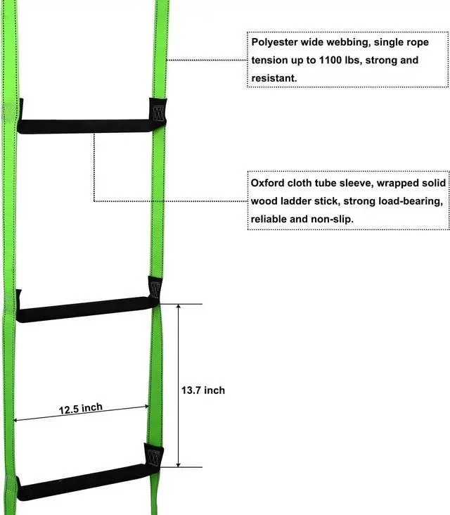 The inner side of the steps is round reinforced solid wood, reliable and non-slip, and the two ends of the round wood are sewn onto polyester webbing, so you don' t have to worry about it spinning during use.