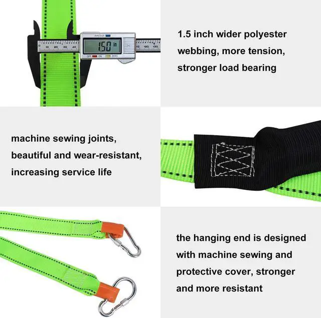 Made of high strength polyester webbing, will not deform or stretch during use, the load-bearing capacity can be as high as 3300 pounds. single rope tension up to 1100 lbs, strong and durable.