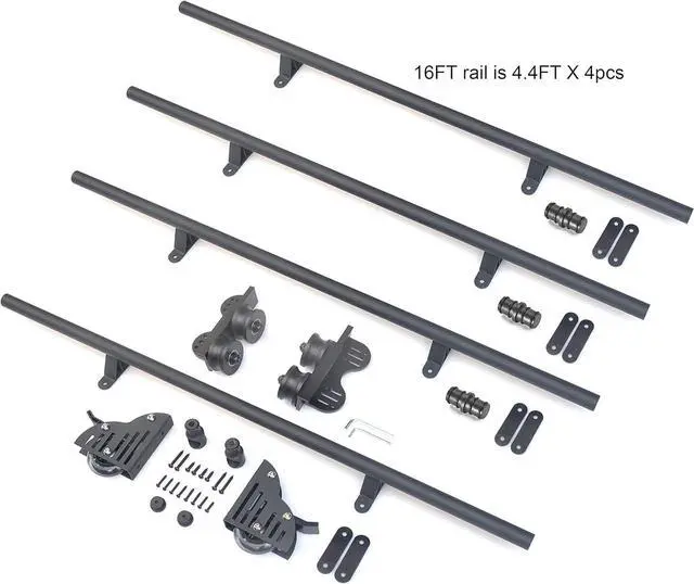 A complete set of hardware including: 4X4ft rail with 2 brackets; 2X Top wheels; 2X Stops; 2X End caps, 2X brake wheels, set screws and a hex key.