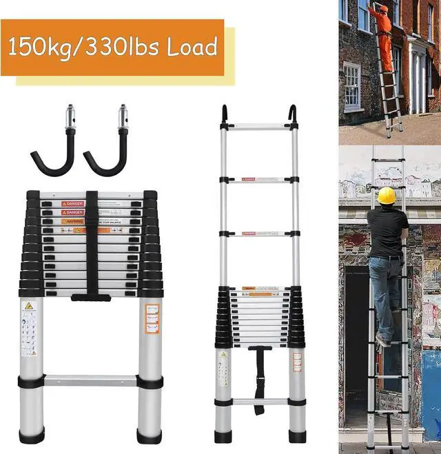 Safe and Compact: This extension ladder comes with 2 detachable hooks for secure fixing. Featuring durable aluminum design, industrial-grade lock latches and anti-slip rubber feet. The telescopic ladder is approved by safety standard EN131, Max
