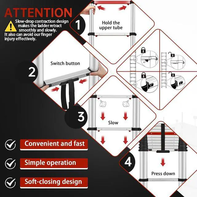 : The telescoping extension ladder can be retracted at any length. There is no need to retract components separately, saving you time. Press two thumb buttons, all steps will automatically descend at a smooth and slow speed until the ladder is into totally closed position. It ensures that your fingers will not be pinched. It is so convenient to operate.