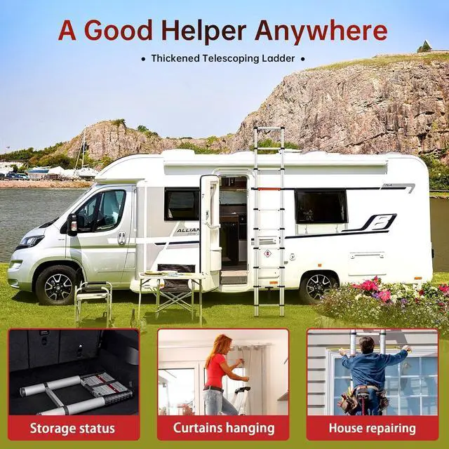 & -: Our lightweight, telescoping ladder features an integrated handle and velcro strap for easy transport. Female users can also carry it effortlessly due to its lightweight frame. Whether you are decorating or outdoor activities, this ladder can meet you, such as changing light bulbs, garden work, fetching items from the roof, painting walls and so on.