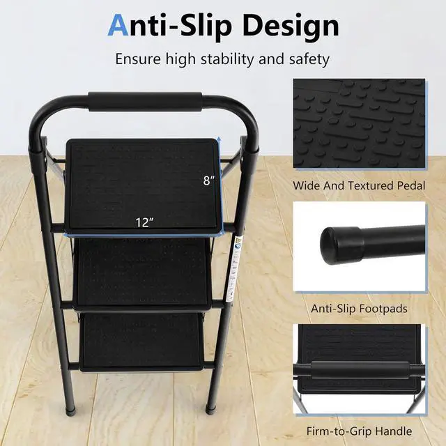 Non-Slip & Safe Ladder: Multiple parts of this step ladder are anti-slip, which effectively prevent potential dangers. The 12 x 8 (L x W) wide pedal with textured surface enables you to stand stably during operation. The handle with padded design is firm to grip. Plus, the non-slip footpads also make the ladder much sturdier.