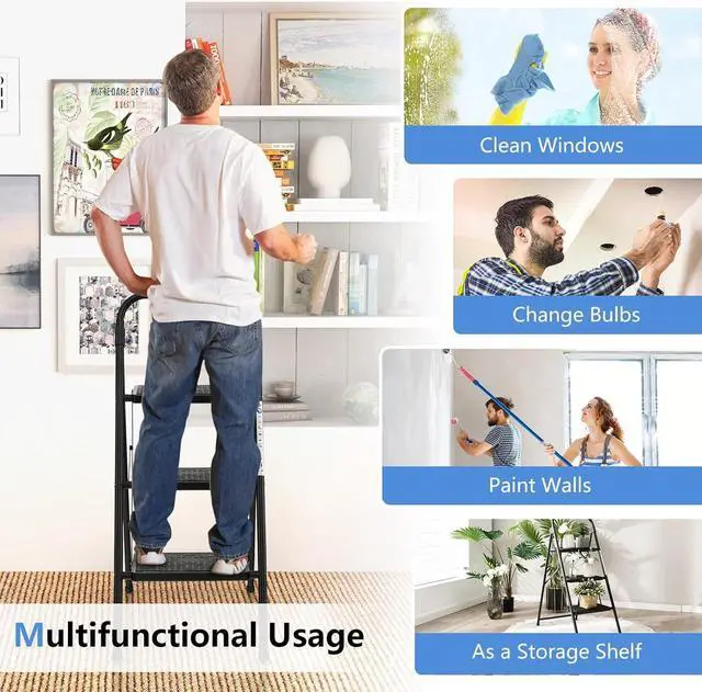 Wide Range of Applications: This portable ladder with high functionality is ideal for multiple places such as home, office, warehouse and so on. It will help you a lot when you want to clean windows, change bulbs, fetch things from high place or paint walls.