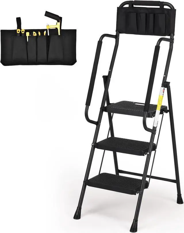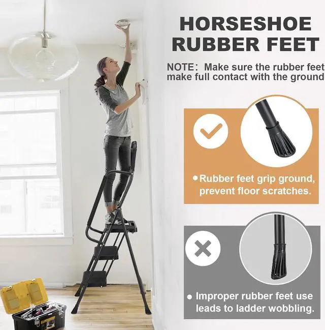 VARIOUS OCCASIONS: This portable ladder with handrails is versatile and can be used in a variety of settings, such as in the home, garage, outdoors. Please ensure that it' s placed on a flat surface and kept away from children for safety purposes