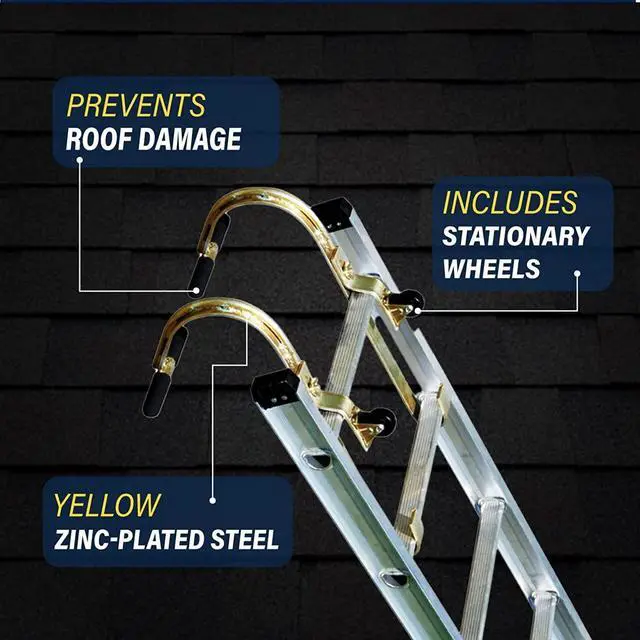 [CONTROLLED MOVEMENT AND PLACEMENT] With stationary wheels that do not swivel, the Ladder Hook with Wheel offers more controlled movement and precise placement of the ladder over a roof' s peak. This feature allows users to maneuver the ladder with greater accuracy, ensuring optimal stability and safety during roof access.