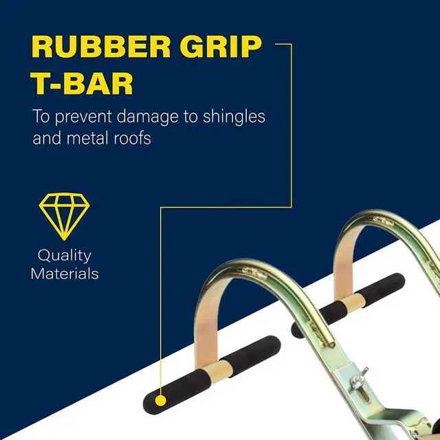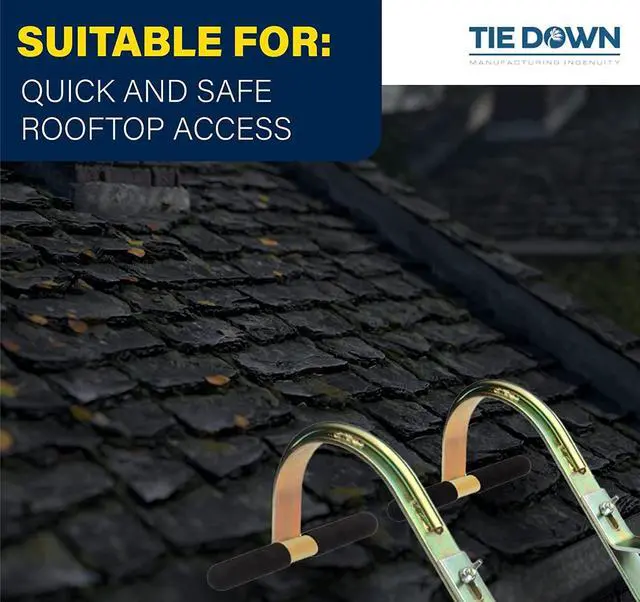 [EASY ATTACHMENT AND USAGE] Attaching the Ladder Hook simply involves securing it to the two top rungs of any ladder or ladder extension. When using Tie Down' s Ladder Hook, roll or slide the ladder until the ladder hooks pass over the roof' s peak. This straightforward process ensures efficient and hassle-free setup, saving you valuable time and effort on the job.