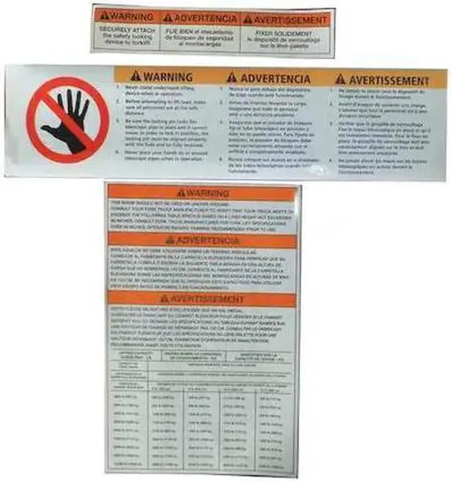Fork Truck Booms Label Kit, Product Type Fork Truck Booms Label Kit, Compatible with Grainger Part Number 4WYR7, 4WYR8, 4WYR9, 4WYT1, 4WYT2, 4WYT3, Includes (2) Capacity Labels, Securely Attach Warning Label, Warning Label. This item has been restricted from sale in the following state (s): []