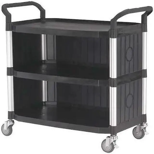 Enclosed Service Cart, Load Capacity 400 lb, Material Fiber Glass, Polypropylene, Color Black, Overall Length 43 5/8 in, Overall Width 20 1/4 in, Overall Height 39 3/4 in, Number of Shelves 3, Caster Type (2) with Brake, (4) Swivel, Caster Material Thermoplastic Rubber, Distance Between Shelves 10 7/8 in, Shelf Length 36 1/4 in, Shelf Width 20 1/4 in, Lip Height 19/64 in, Includes Enclosed Panel, Ergonomic Handle. This item has been restricted from sale in the following state (s): []