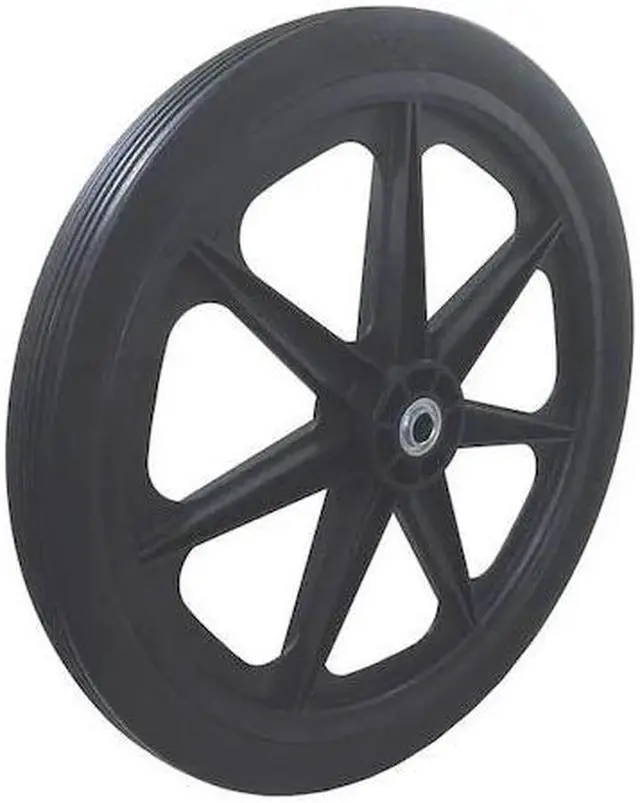 Flat-Free Wheel, 250 lb Load Rating, Ribbed Tread, 19 1/2 in Wheel Dia., 2 1/2 in Wheel Width, For Axle Size 3/4 in, 20x2, Standard Tire Rim Type, Center Mount Hub Position, 2 7/16 in Hub Length, Plastic Hub Material, Yes Non-Marking. This item has been restricted from sale in the following state (s): []