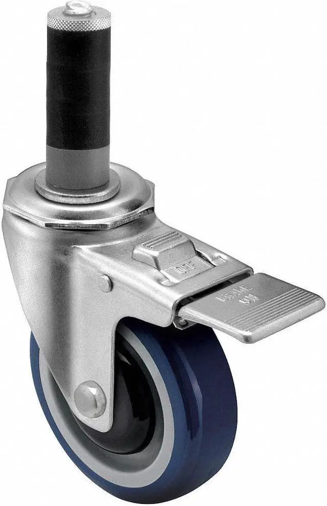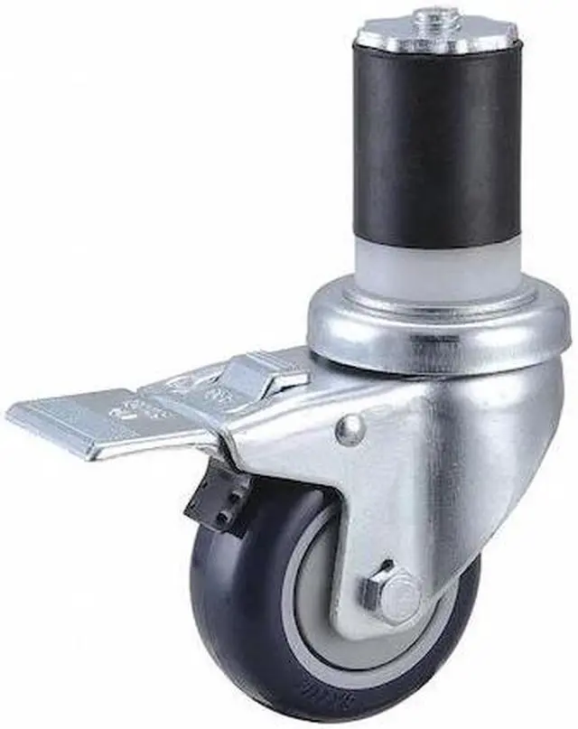 California Proposition 65: This product contains a chemical known to the State of California to cause birth defects or other reproductive harm. Stem Caster, Swivel Caster with Brake, 250 lb Load Rating, 0 to 299 lb, 3 in Wheel Dia., 1 1/4 in Wheel Width, Polyurethane Wheel/Tread Material, 4 1/4 in Mounting Height, Ball, 1-37/64 in x 2-37/64 in Caster Stem Size, Expanding Adapter, Steel Caster Frame Material, Zinc Plated Frame Finish, Yes Non-Marking, 1 Number of Wheels. This item has been restricted from sale in the following state (s): []