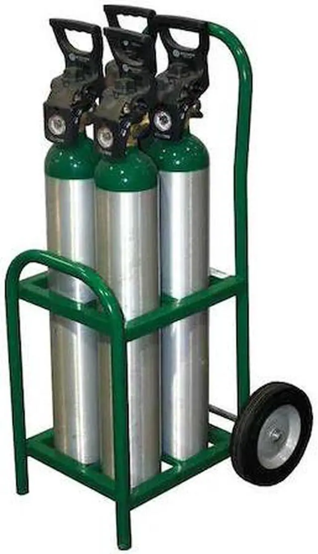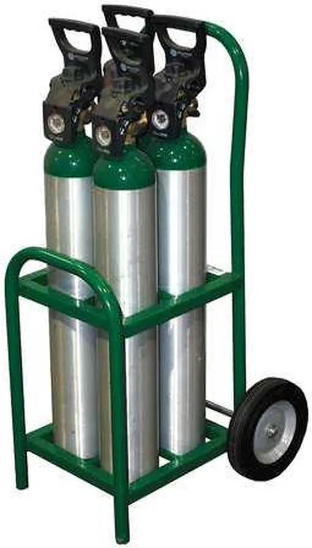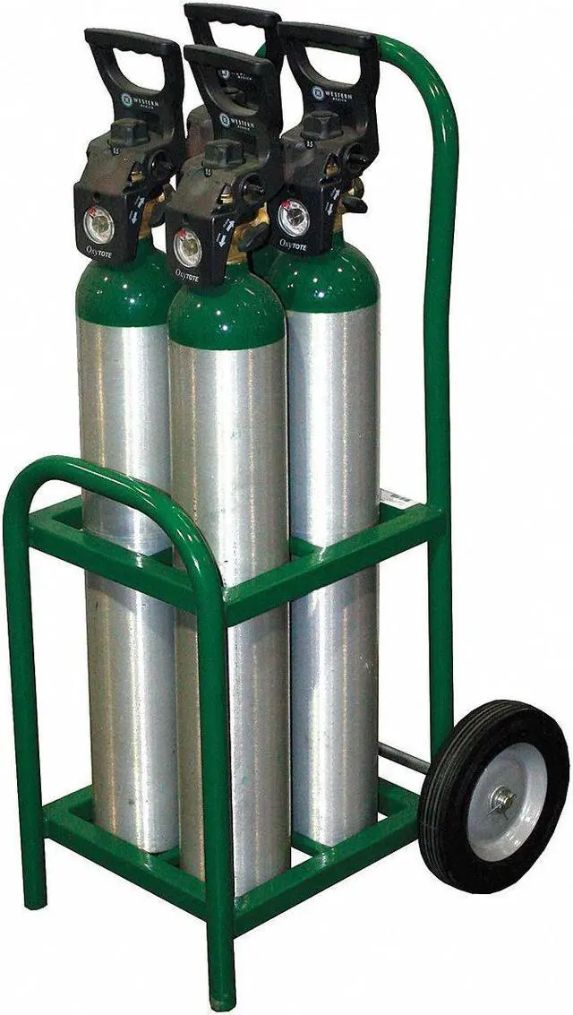 Two-Wheel Tilt-Back Vertical Medical Cylinder Cart, Load Capacity 250 lb, Cylinder Capacity 4, Cylinder Storage Orientation Vertical, For Max. Tank Dia. 4 1/2 in, Axle-Mounted Wheel Dia. 8 in, Axle-Mounted Wheel Type Semipneumatic, Caster/Wheel Configuration (2) Axle-Mounted, Overall Depth 15 in, Overall Width 12 in, Overall Height 35 in. This item has been restricted from sale in the following state (s): []