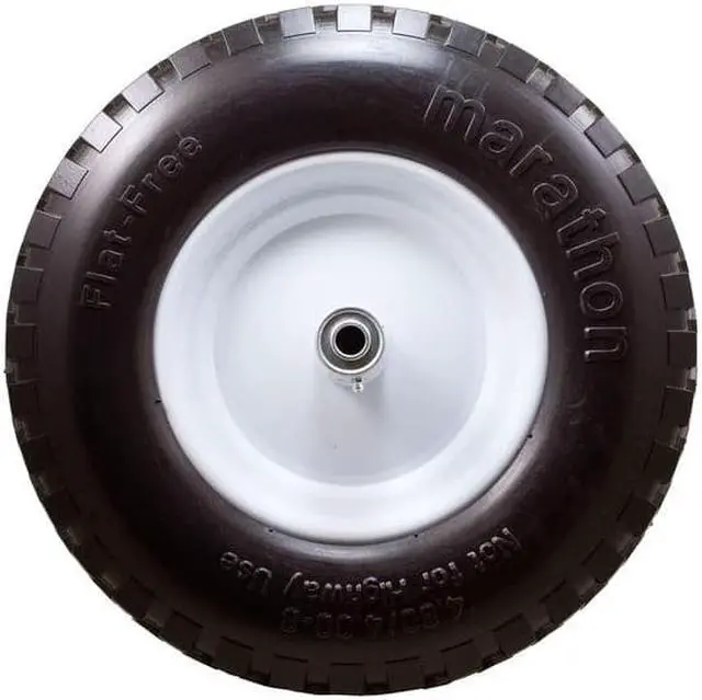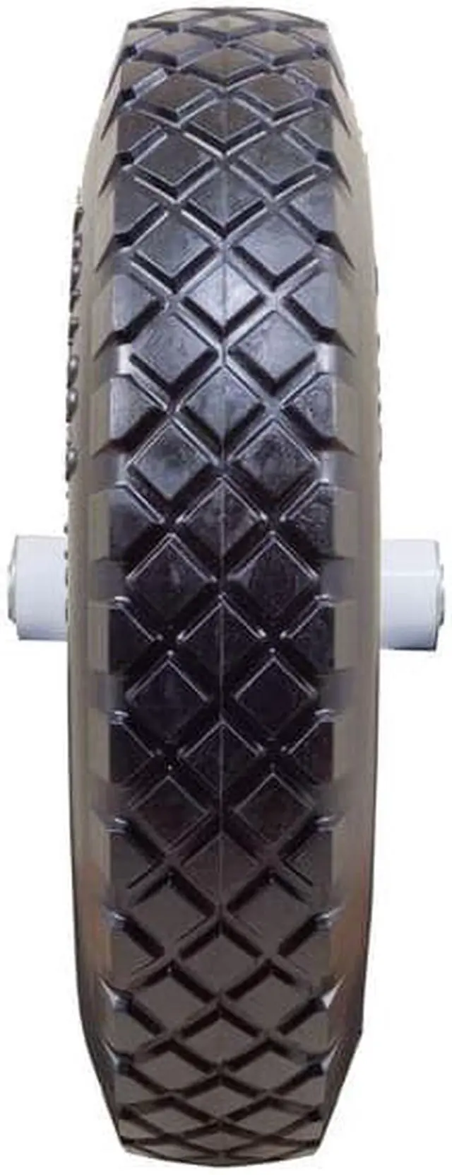 Flat-Free Wheel, 500 lb Load Rating, Knobby Tread, 15 1/2 in Wheel Dia., 3 1/4 in Wheel Width, For Axle Size 5/8 in, 4.80 / 4.00 -8, Standard Tire Rim Type, Center Mount Hub Position, 6 in Hub Length, Steel Hub Material, Yes Non-Marking. This item has been restricted from sale in the following state (s): []