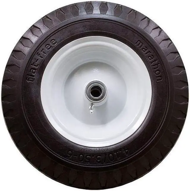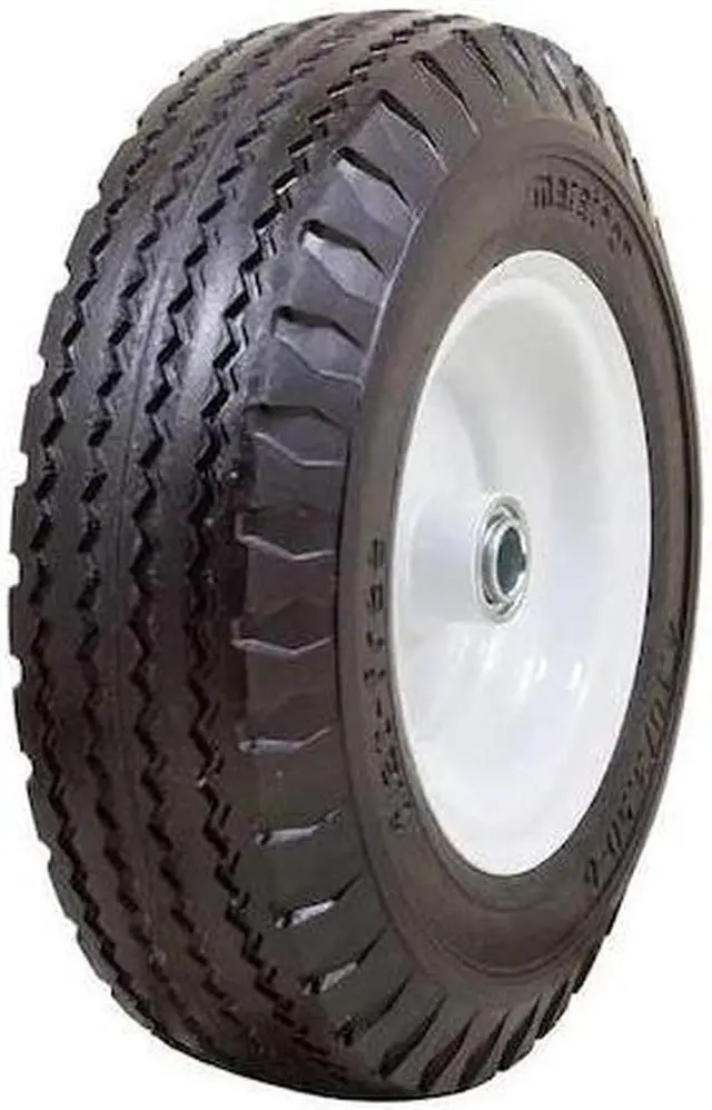 Flat-Free Polyurethane Foam Wheel, 400 lb Load Rating, Sawtooth Tread, 12 13/32 in Wheel Dia., 1 7/8 in Wheel Width, For Axle Size 3/4 in, 4.10 / 3.50 -6, Standard Tire Rim Type, Center Mount Hub Position, 4 31/64 in Hub Length, Steel Hub Material, Yes Non-Marking. This item has been restricted from sale in the following state (s): []