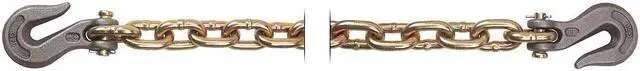 Straight Chain, Chain Type Transport Chain, Material Carbon Steel, Lifting Capability Not for Lifting, Working Load Limit 4, 700 lb, Chain Grade 70, Trade Size 5/16 in, Link Inside Length 1 1/8 in, Link Type Straight, Link Inside Width 1/2 in, Overall Length 10 ft, Links per Foot 11, Compatible Fitting Thickness 5/16 in, Includes Hook Hook Included, Hook Type Included Grab Hook, Finish Gold Chromate, Material Thickness 21/64 in, Weight per Foot 1.02 lb, Welding Type Welded, Standards NACM.