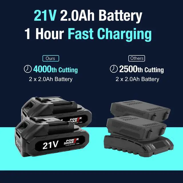 Long-lasting Battery Performance with LCD DisplayEquipped with two 2000mAh lithium batteries, this tool ensures extended runtime and quick recharging, allowing you to work longer without interruptions, making it ideal for larger gardening tasks. The LCD display shows the battery level and trim times.