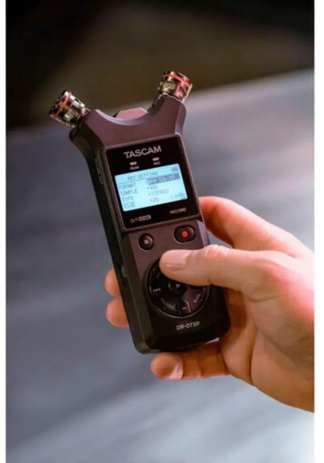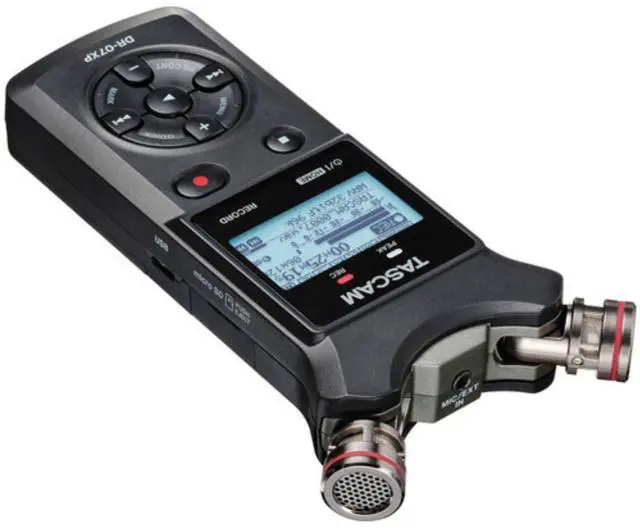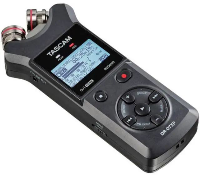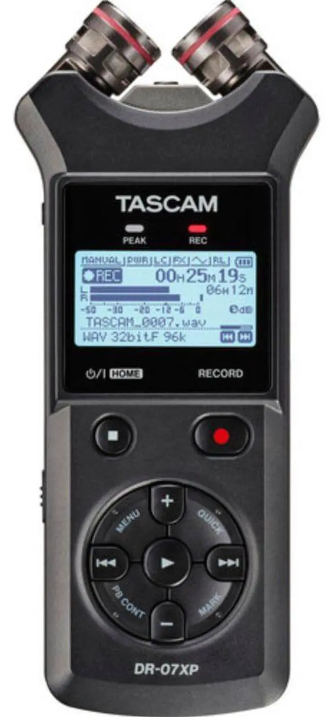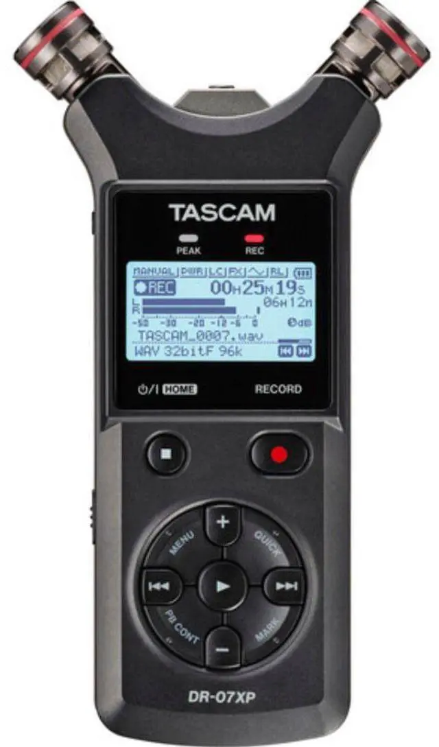 TASCAM DR-07XP portable handheld recorder is capable of capturing two tracks of audio at 32-bit float, high-resolution with no external microphones required. Its adjustable onboard cardioid condenser mics can be configured in an A/B or X/Y arrangement for spacious stereo imaging of your source. Equally adept as a handheld device or stand-mounted or camera-mounted setups, the DR-07XP can handle anything from sampling sessions and recitals to interviews and podcasts.