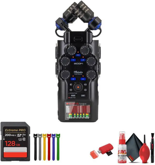 • Bundle Includes: Zoom H6studio 8-Track 32-Bit Float Handy Recorder + Cable Ties Reusable + Cleaning Kit + 128GB Memory Card + Diginerds USB Card Reader SD/microSD. STUDIO-GRADE 32-BIT FLOAT RECORDING: Capture distortion-free audio in any environment with dual A/D converters and 32-bit float technology, delivering up to 132 dB of dynamic range. Ideal for music production, film, podcasts, and field recording where levels shift unexpectedly and clean, uncompressed audio is essential.. FOUR ULTRACLEAN F-SERIES PREAMPS: Record with clarity using four XLR/TRS combo inputs featuring -127 dBu EIN, +48V phantom power, and dedicated gain knobs. Supports microphones, instruments, and line-level sources for flexible multitrack sessions. RF shielding minimizes interference from phones and wireless devices.. EXPANDABLE WITH CAPSULE SYSTEM 3.0: The next-generation Zoom capsule system allows interchangeable microphone and input modules, including wireless options. The included 19.4mm X/Y mics capture