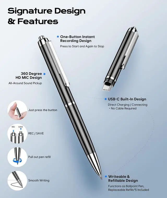 One-Touch Recording : Press to Start Record, Press again to pop up the button to save, the audio recorder switch operates like a ballpoint button. Simple operation can be activated when needed. Stand by at any important moment to avoid missing the content of important courses and meetings or missing the details of business negotiations.