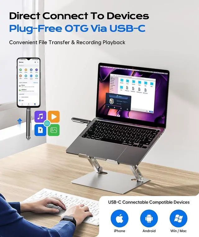 Type-C Port Built-in, Get Rid of Data Cable & Smooth Connection : The Voice Recorder Device comes with a Type-C jack, which allows you to connect to Windows/Mac computers and Android/IOS smartphones without a data cable to realize bi-directional transmission. The audio recorded by the voice recorder can be played back through headphones as well as on your computer phone. Also the digital voice recorder can be used as a USB external hard disk. The recorder can also be plugged directly into a device with a C port for charging, making it easy to use.