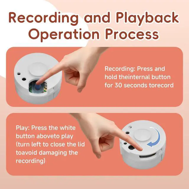 Simple operation: The recordable button is designed for ease of use. Simply rotate the lid to the notch and press the button inside to record. Press the circular button on the white cover to play your message