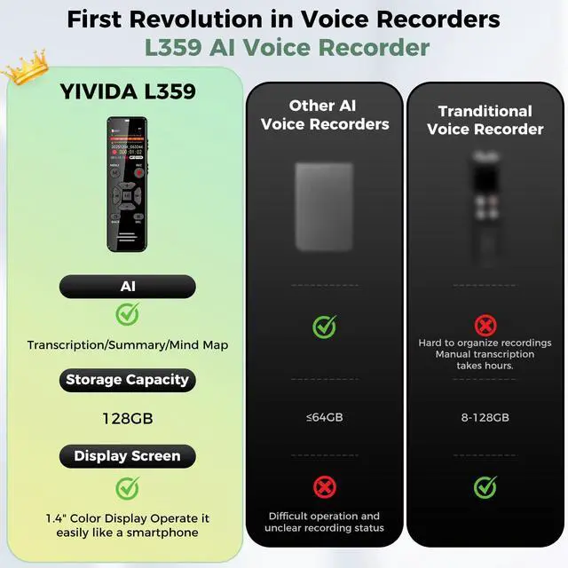 Note: L359 does not use Bluetooth. Simply record on the device, then connect to your phone via the supplied OTG cable to import files into the AI DVR Link app. Unlike Bluetooth, the wired connection provides faster transfer speeds, higher stability, and reliable performance for large audio files.