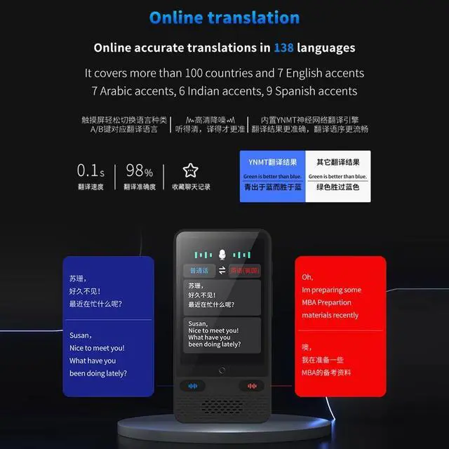 1.Seamless Multilingual Communication: Our intelligent language translator device facilitates smooth communication betweenindividuals speaking different languages. With support for 18system languages,online translation of 138 languages, and offin translation of 16languages, it ensures effective communication in various scenarios.