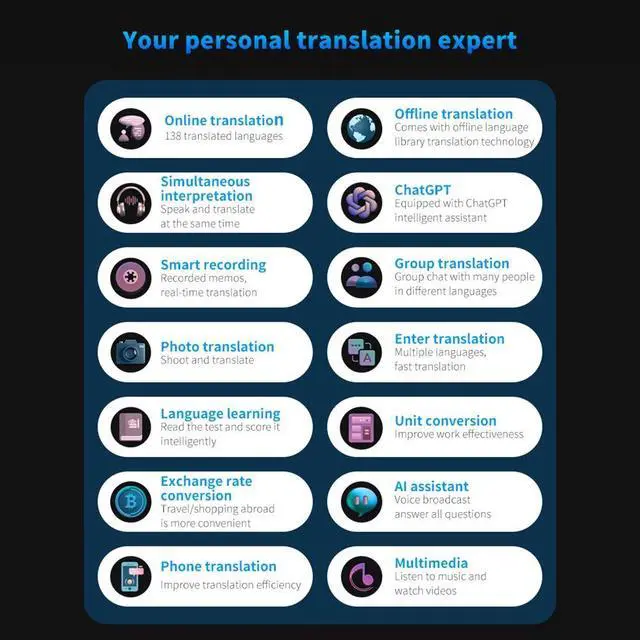 4.Enhanced Functionality: With a built-in 5-megapixel HD camera and a 3.54-inch HD capacitive touchscreen, the real-time translation device ensures clear display of translated content. Additionally, it supports world clocks, music playback, recording,video playback, and real-time conversion of up to 25 currency exchange rates.catering to diverse needs.
