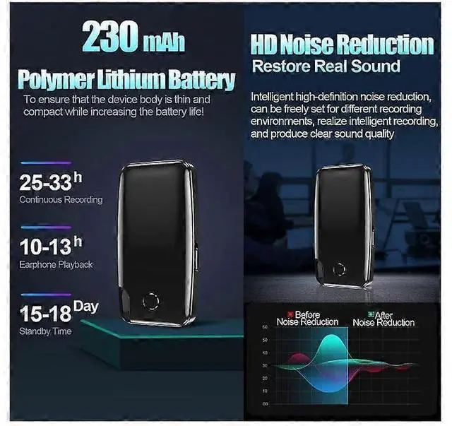 Up to 30 hours continuous recording time from built-in 230mAh battery
