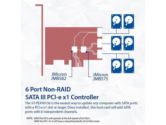 - Supports 6-port 6Gb/s SATA III interface,Supports Port Multiplier,Supports Hot-Plug,Supports drive power control and staggered spin-up.Supports SATA Partial / Slumber power management state.