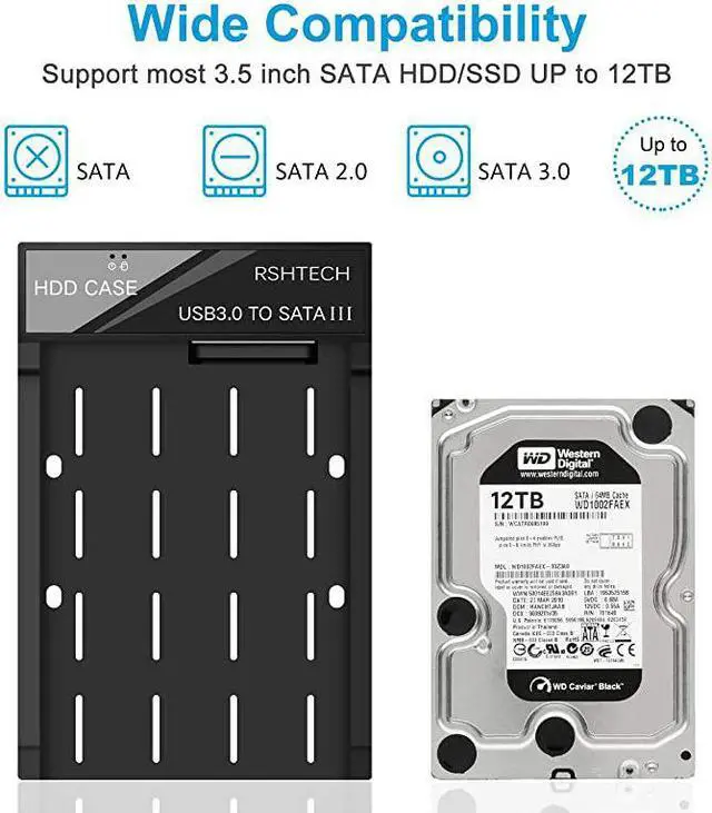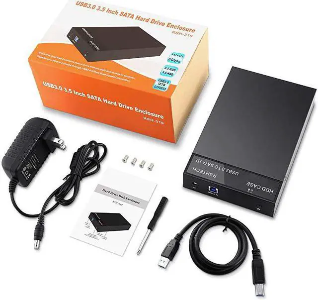 Package Contents: 1x 2.5 / 3.5 Inch SATA Hard Drive Enclosure 1x 12V/2A Power Adapter 4x Fixed Hard Drive Screws 1x USB 3.0 Data Cable 1x Instruction