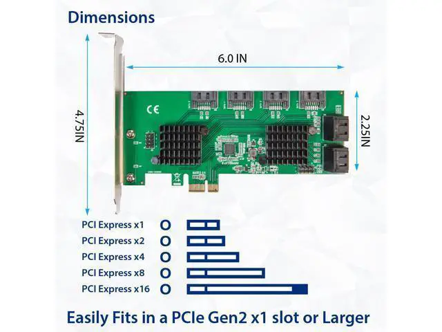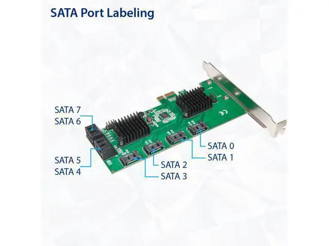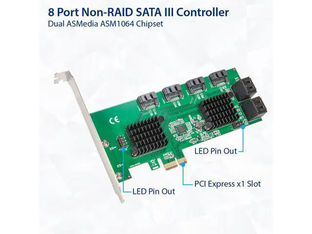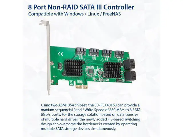 8 Port SATA III to PCIe 3.0 x1 NON-RAID Expansion CardPCIe Gen3 X1 interface to 8 ports NONE-RAID SATA III 6Gbps card will allow users add 8 x SATA III ports on desktop PCs, Servers, and NAS systems for storage expansions or AHCI boot use. Select the ASMedia ASM1064 the most stable Non-Raid PCIE 3.0 SATA controller solution. PCIE 3.0 X1 interface provide 8Gbps total bandwidth. Each SATA 3.0 port will get 6Gbps max speed for AHCI boot and storage. Supports Communication Speeds of 6.0G bps, 3.0G bps, and 1.5G bps.